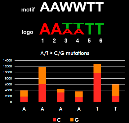 What are mutational signatures? Mutational signatures are defined by the detection of certain mutations at certain sequence contexts or motifs. For instance, tobacco smoke causes an excessive amount of C -> A substitutions and these mutations occur predominantly at ACG sequence triplets or contexts (ACG -> AAG). In this study, we show the mutational signature of A/T -> C/G substitutions, which occur at AAWWTT sequence context, where ‘W’ is ‘A’ or ‘T’ base.