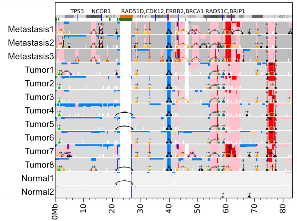 At the DNA-level, there are two basic types of genes that promote tumorigenesis: oncogenes and tumor suppressors. Typically, oncogenes that drive cell growth and division, elongate cell survival and promote ignoring signals from the cells immediate microenvironment are amplified. Tumor suppressors, the safeguard genes, are either deleted or made inactive by mutations in their assembly instructions. A cell does not instantly become cancerous with a single mistake, but by an accumulation of smaller and larger mistakes and aberrations in its source code during years or decades of life, spanning multiple generations of the cell’s lineage. It is important to note that the large majority of mistakes that happen in cells simply make them less fit and less viable. Over long time periods, some of the randomly occurring mistakes during the copying and maintenance of the DNA happen to hit such precise locations that they promote tumorigenesis. Predisposing risks for certain types of cancer that may run in a family simply take the number of such required mistakes a notch or two lower. By sequencing the DNA of a malignant tumor, it is even possible to trace back in time the order in which the oncogenic, tumor driving events occurred.