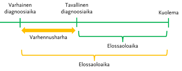 Sometimes, despite early detection of cancer, the patient’s life is not prolonged. The time of death is the same regardless of the timing of the diagnosis, and thus, screening does not lead to a better treatment outcome. This is reflected in the so-called lead-time bias (see image below), the overestimation of the survival ratio. Although the estimate seems to have improved, the patient has not gained additional life years. The quality of the patient’s life towards the end deteriorates when possibly heavy treatments are started unnecessarily early. This is in contrast to the idea of cancer screening which aims to improve the health of the population, not cause extra concern or useless treatments.