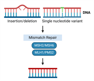 Lynchin syndrooma on perinnöllinen geneettinen oireyhtymä, joka nostaa yksilön riskiä sairastua erityyppisiin syöpiin, erityisesti kolorektaalisyöpään tai kohdunrungon syöpään. Lynchin syndroomassa ihminen perii virheellisesti toimivan version yhdestä DNA:n virheiden korjaukseen osallistuvista “mismatch repair” geeneistämme. Mismatch repair on yksi monista soluissamme toimivista DNA-virheiden korjausmekanismeista. Nimi mismatch repair eli vapaasti suomennettuna “epävastaavuuksien korjaus” viittaa siihen, että kyseinen korjausmekanismi on vastuussa kahden DNA-juosteen välillä havaittujen epävastaavuuksien korjauksesta. Tällaiset DNA:n kopiointivirheet ovat tavanomaisia normaalin solunjakautumisen yhteydessä; mismatch repair koneisto kulkee tiukasti kopioitavan DNA:n perässä ja korjaa kopioinnissa syntyvät epävastaavuudet. Soluissamme on kaksi kopiota eli alleelia jokaisesta geenistä, eli vaikka Lynchin syndroomaa sairastavilla henkilöillä onkin yksi virheellinen versio mismatch repair -geenistä, DNA:n korjausmekanismit toimivat normaalisti jäljellä olevan toimivan alleelin ansiosta. DNA:n korjaus solussa mismatch repair-koneiston avulla kuitenkin pysähtyy, mikäli myös geenin toimivassa alleelissa tapahtuu sen toimintaa vaurioittava mutaatio. Epävastaavuuksien korjauksen loppuminen soluissa johtaa mutaatioiden suureen kertymiseen ja lopulta, mikäli immuunijärjestelmä ei pysty hävittämään näitä soluja, ne jatkavat jakautumistaan ja kehittyvät syöväksi.